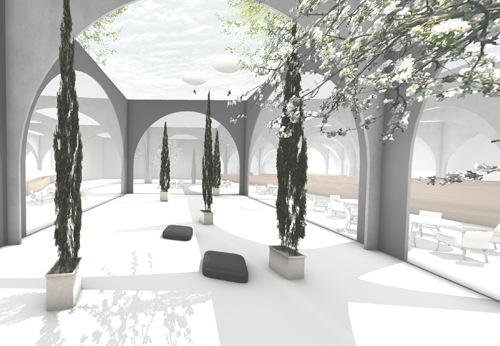 // Through glass roofs and green courtyards experience the user different lighting situations.