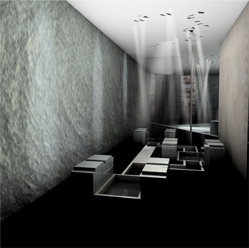 Hamam besteht aus drei Grundelementen: Stein, Wasser und Licht. Durch kleinen Dachöffnungen wird Lichtstrahl punktweise reingeführt und so wird eine besondere Halbdunkele Atmosphäregeschaffen. Der Stein wirkt weich, warm und einladend. Der Raum wird zum Waschen verwendet,Raum zur entspannen, zum ertasten.